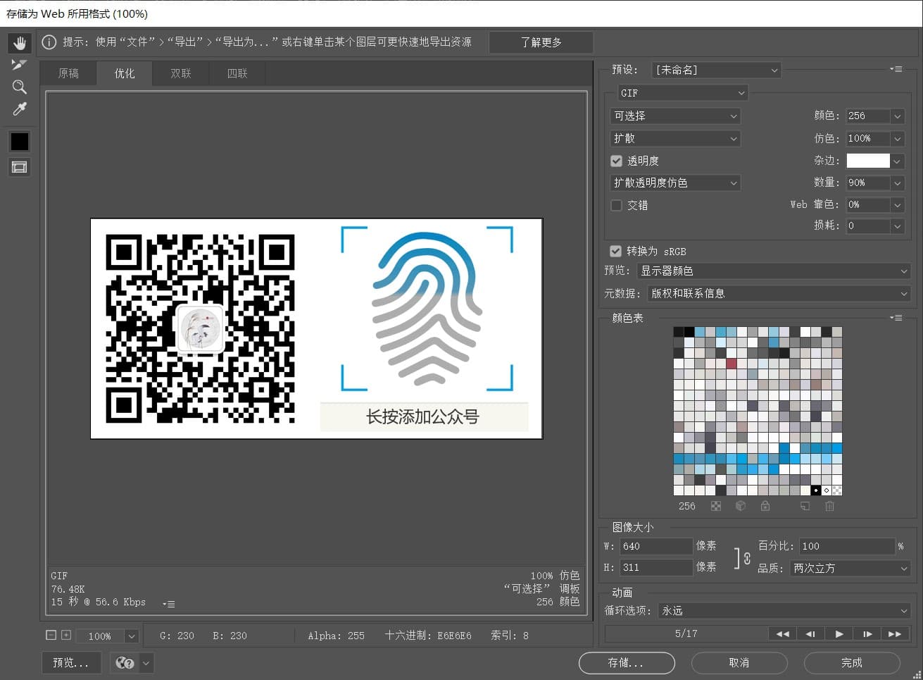 所有设置都需根据实际的预览效果更改,如颜色较少的动图完全可以大胆的选用128甚至64种色位,如果出现不能接受的颜色断层,则需要使用256的色位且开启90%以上的仿色。
