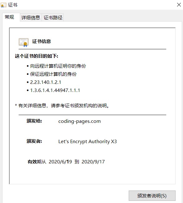 证书颁发给coding,颁发机构是let's encrypt,有效期是到9月