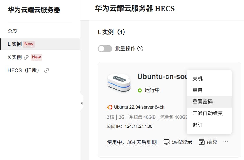 带宽虽然低了点,但是46块能用一年,比其他家的首单甚至学生优惠都要便宜,直接下单一个。购买后首先要重置服务器密码,找到控制台 > 我的资源 > L 实例 > 重置密码,之后就可以通过 ssh 连接到服务器。